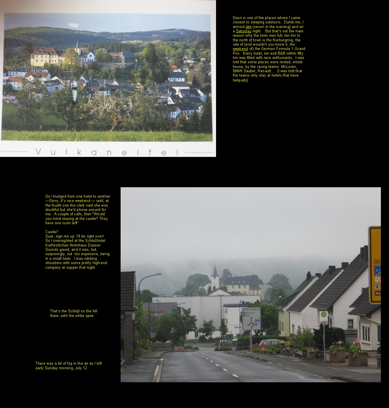 July 11. Heinzenbach to Daun, 62 km. Around noon I crossed the Moselle, Germany's most famous wine region. This is the town of Zell. As well as being a wine town, it's aport of call for Moselle cruisers. Upstream from here the Moselle flows out of France and Luxembourg. Downstream it joins the Rhine and flows to the sea at Rotterdam. |