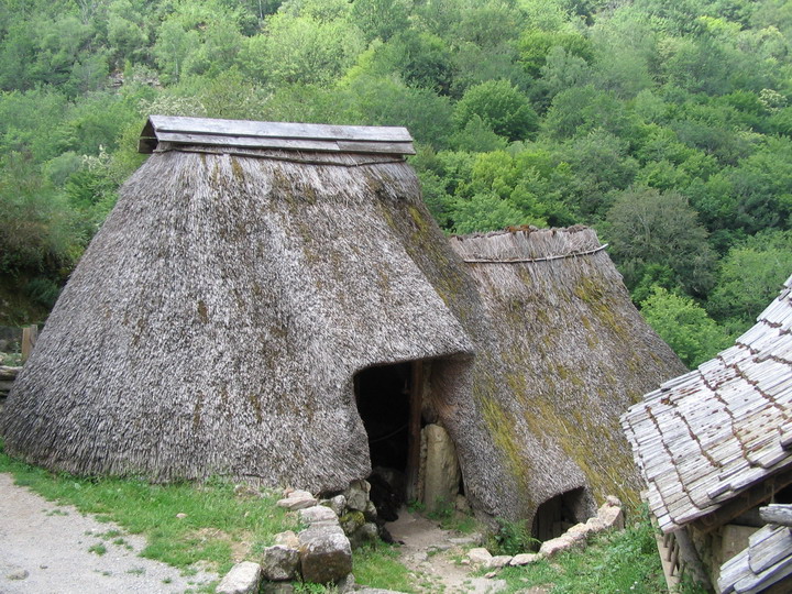 One of the replica farmhouses in the reconstructed medieval village. Humans to the left, anmals to the right.