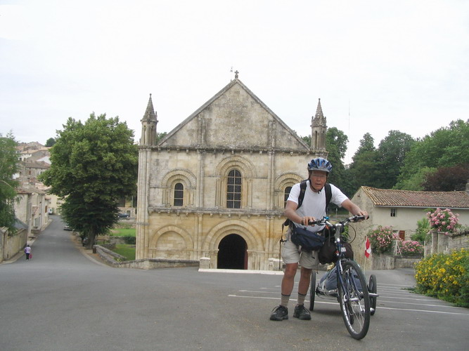 June 20 Next morning Julie and I set off, à vélo, on a tour of town and then some help and advice about my day's journey down to Saintes. This picture is me puffing up the hill past the église St. Hilaire, one of three romanesque churches in town. My route, recommended by my hosts, kept close to the litlle river Boutonne, and stayed off the highway. |