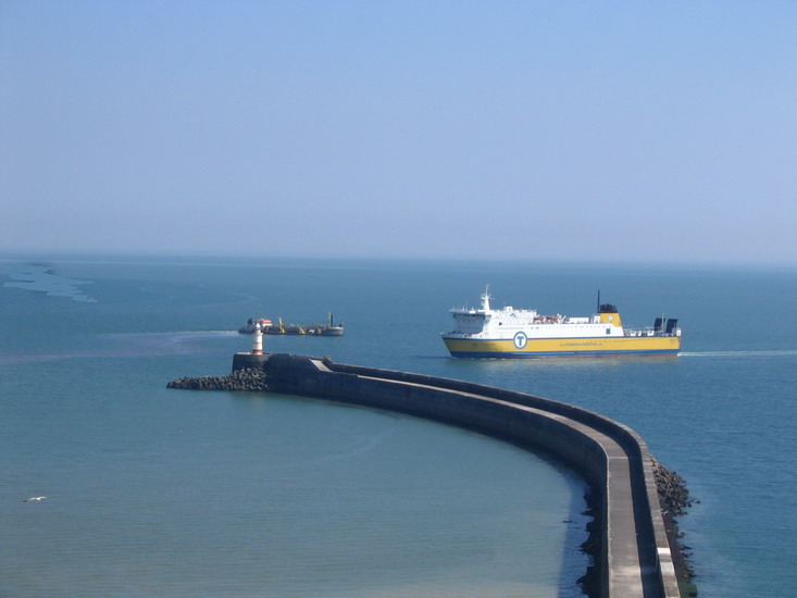 June 8, 2006 The ferry "Dieppe" arriving in Newhaven , late afternoon. I watched the smaller boat on the left take all afternoon to chug out of the harbour at ~¼ knot. I think they were killing time so they could dump their cargo overboard after dark. |
