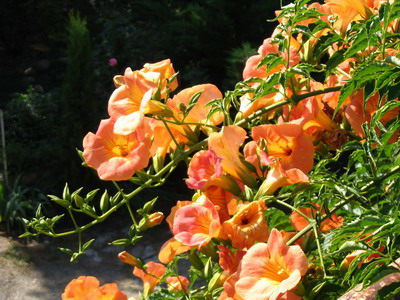 I encountered this brilliant orange shrub growing out onto the road in a village south of St. Antonin. My reasearch tells me it is a type of trumpetflower .