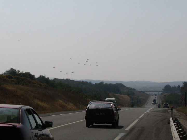 July 4 As I rode out of Castres in the morning, a plane flew over and... "pop, pop, pop, .... ". About thirty parachutes drifting to the ground. Castres is the base for one of Frant's paratroop regiments |