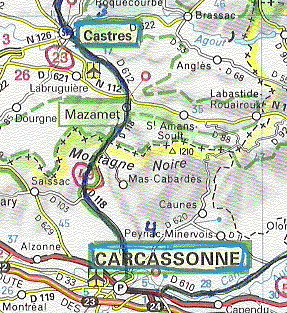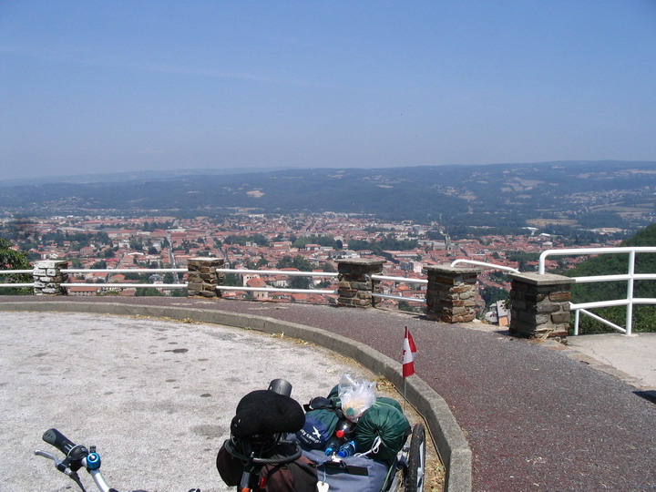 July 4 Looking back to Mazamet as I start the climb through the Montagne Noire. I really hadn't looked very hard at my map, otherwise I might have plotted around instead of over this stretch. 69km for the day (Castres to Carcassonne) 17km of it pushing, à pied [on foot] over the mountains. |