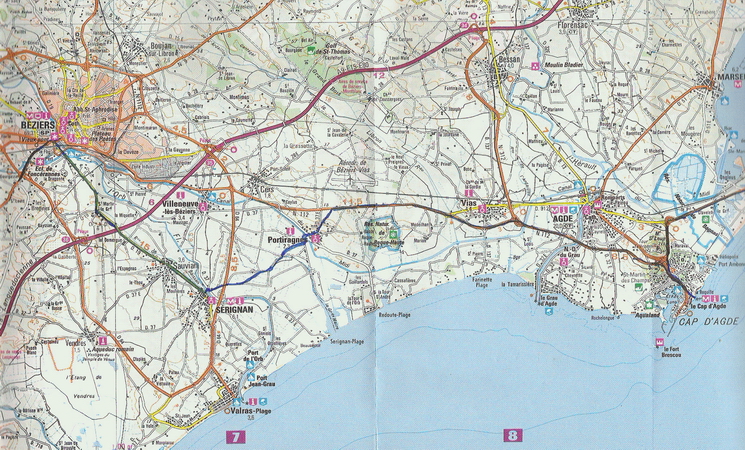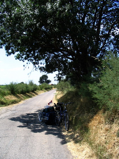 July 6 Taking a shade break on the way to Cap d'Agde. I took some very small 'white' roads (white on the map) to have a look at the marshy farmland and avoid traffic. Sandy fields of rice and corn, close to the beach, interspersed with drainage canals (all dry this time of year). |