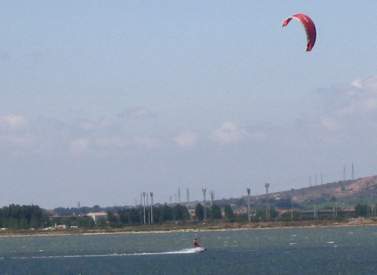 Kitesurfing in l'Étang de l'Arnel [étang = lagoon] east of Sète. The lagoon is only a few feet deep; I saw windsurfers wipe out, stand up, climb back on their board, and take off again.