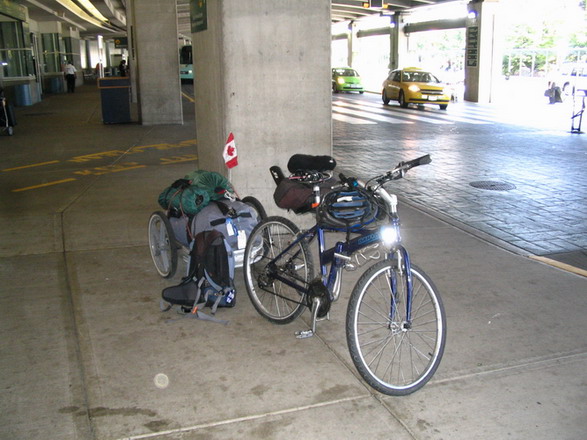 June 20 Left London by Victoria Station to Gatwick. Flight at 10:30 GDT Arrived in Vancouver around 4:00 PM . This is Vélo and Ramorgue at YVR. Reassembled bike, trailer and bags and rode out to the 7:00 PM ferry at Tsawwassen. Pedalled into