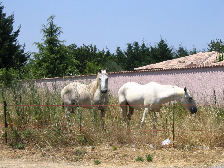 July 8 Camargue horses. These horses (all white) are native to the salt marshy area in the south of France, especially near les Bouches du Rhône [mouths of the Rhône]. Most of the domestic horses in the region are Camargues. |