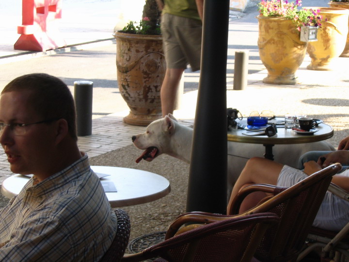 July 8 One of the most civilized aspects of French culture is Dogs In Restaurants. This at the Restaurant de l'Arène, across the street from the coliseum. I asked the owner what kind of dog he was and he answered "C'est un chien Argentat" Hey ! I've been to Argentat!! |