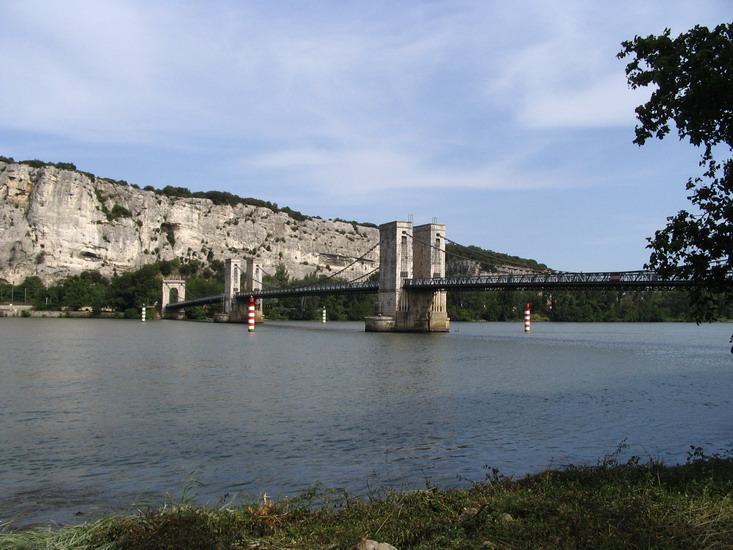 One of a number of tiny one-and--a-half lane suspension bridges that carry D-roads back and forth across the Rhône. This one is at Donzère.