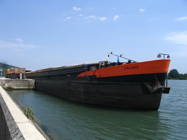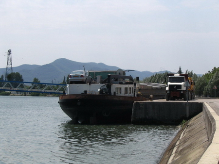 Barge at quaiside on the Rhône. Barges have fulltime, live-aboard crews. The car goes with them.