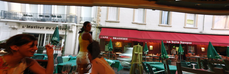 Taverna in Valence. The weather had been hot, but then the rain started. First big drops, then a gusts of cool wind and a downpour. Umbrellas were doused. We all gathered up and rushed inside. Everyone seemed relieved by the break in the weather.