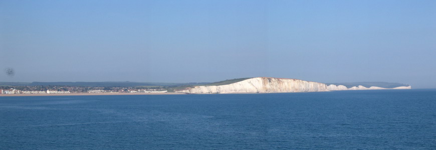 Leaving Newhaven, looking east to town of Seaford. Beachy Head is to the right. Beyond the head is Eastbourne, then Dover.