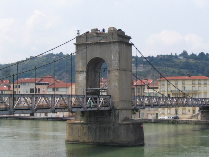 July 14, Bastille Day Vienne's Passerelle Piétonne [pedestrian bridge] Atop the tower you can see workers who spent the day setting up fireworks for the Bastille Day show. Other than that, though, there wasn't much sign of holiday festivity. The stores were mostly closed. |