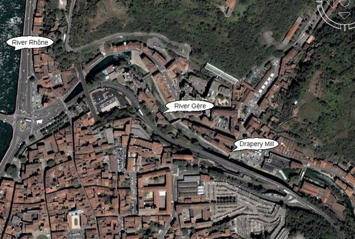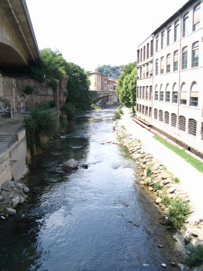 July 14, Bastille Day After a short ride up from Chanas, I had time to tour the town. This is the little river Gère, which flows down through the north side of town. It was the focus of the town's industry in the 1800's; the building on the right was a drapery mill. |